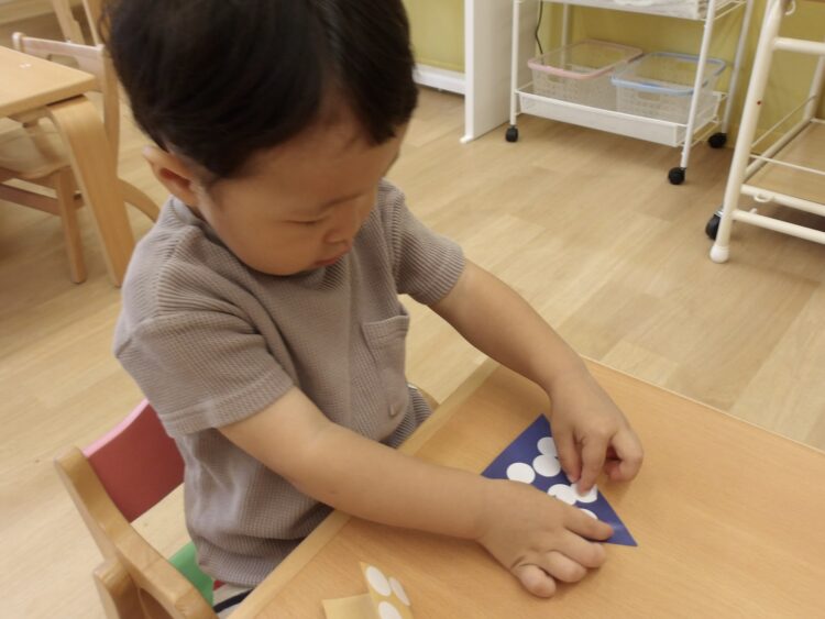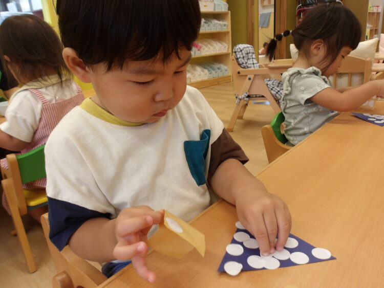 春にも丸いシール貼りをしましたが、その時よりも台紙から剥がして貼るのが上手になっていました![]()