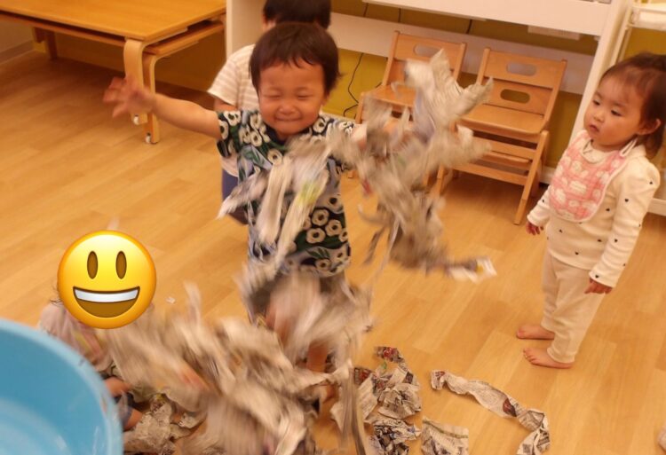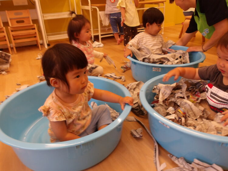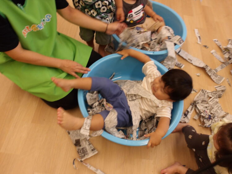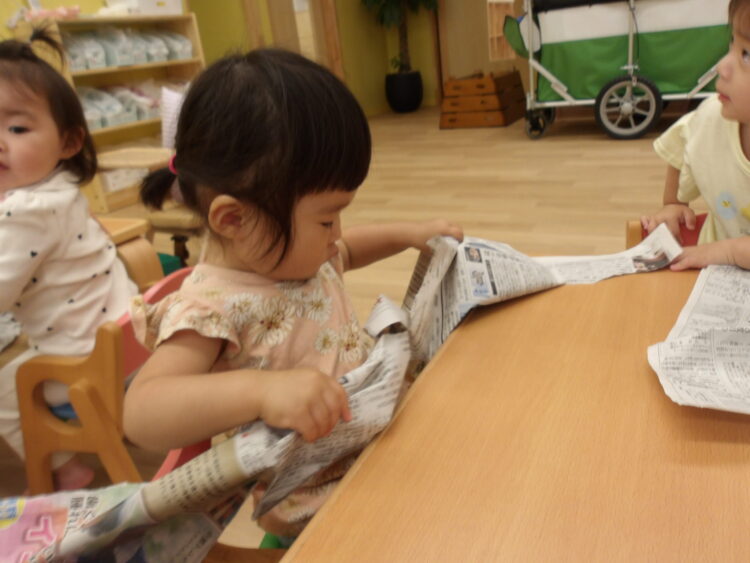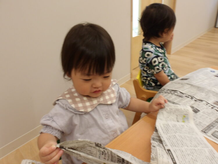 ひよこ組さんとあひる組さんはランチルームで新聞紙遊びをしました!