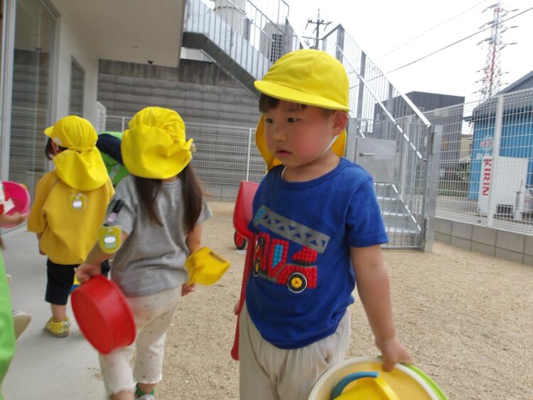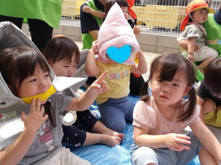 4月はお部屋で防災頭巾を被ってみましたが、今日は実際に園庭に避難をします。