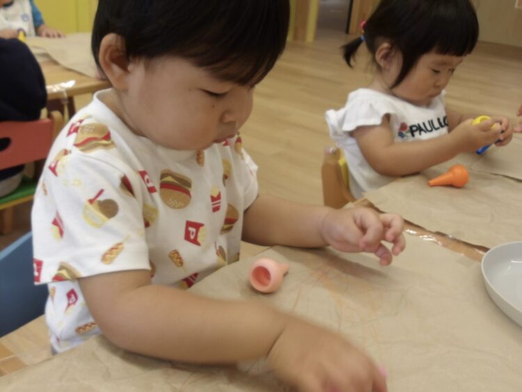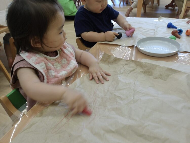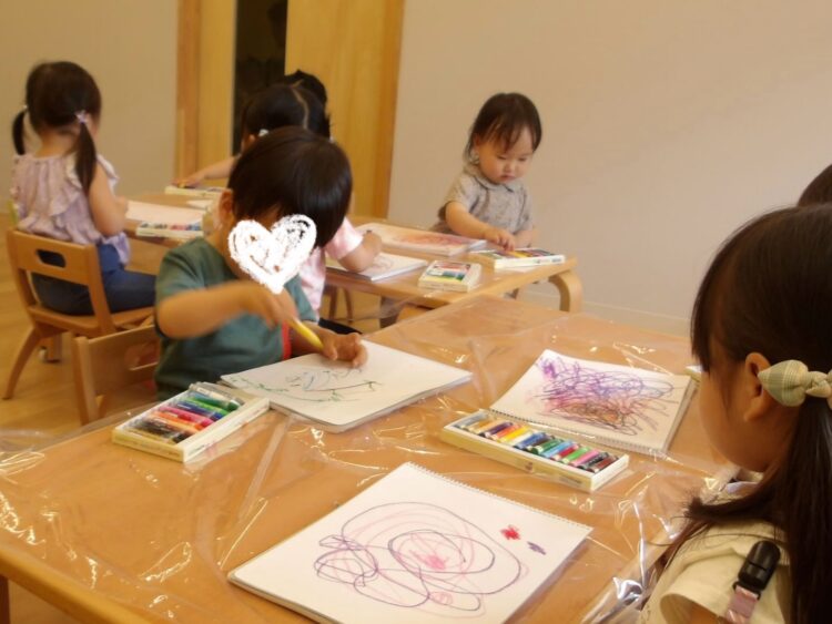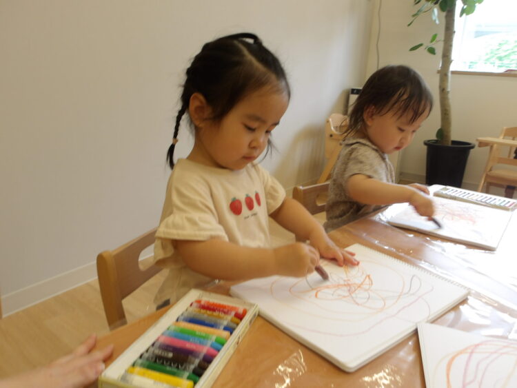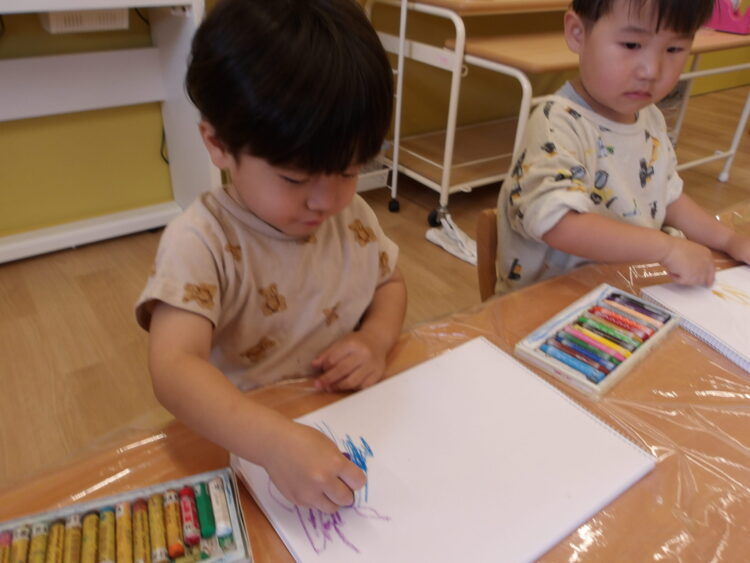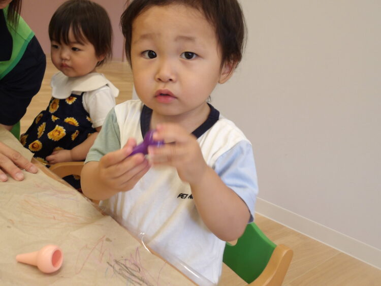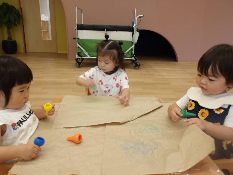 丸いクレヨンをみんなで使いながら、色が付く感覚を味わってみました