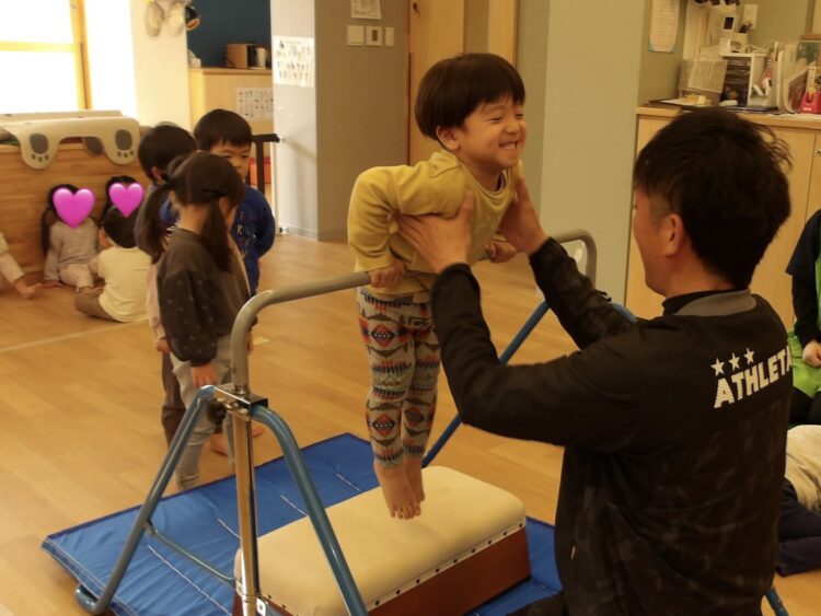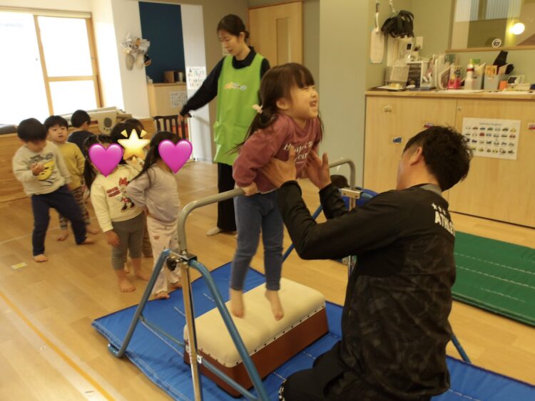「鉄棒の上に顔が来るぐらいに上がれると逆上がりも出来るようになるよ!」と言われると子供達も頑張って踏ん張っていましたよ!😊