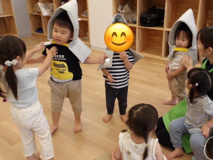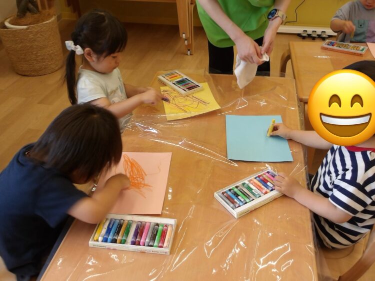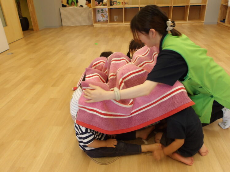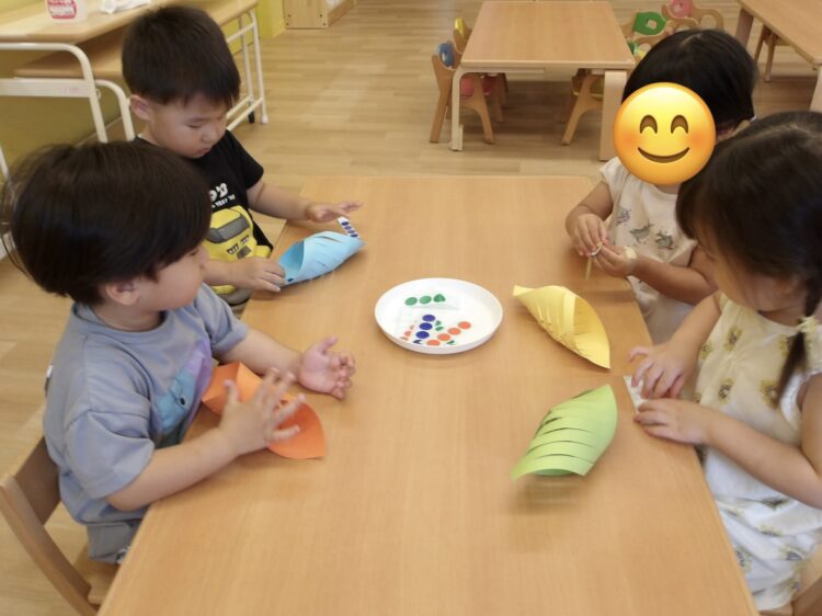 終わった後の自由遊びでは、おままごとで花ビーズをラムネに見立ててアイスにトッピングして遊んでいましたよ☺️