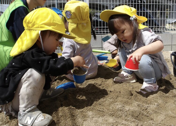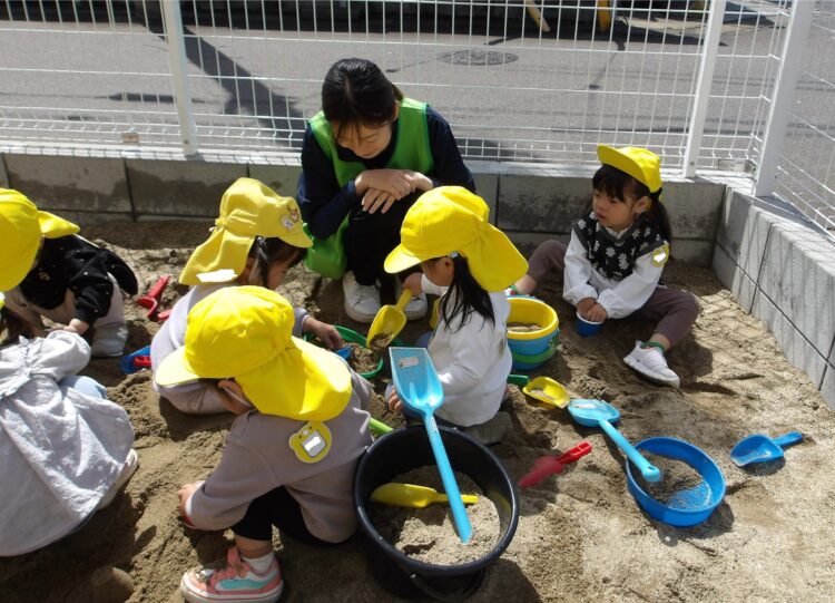 今日も、あひる組とうさぎ組で一緒に散歩にでかけました。園を出て、園の前で工事をしている人達に手を降りながら出発。さっそく近くの橋へ。