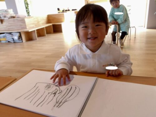お絵描きコーナーではこれがグーでこれがパーだよと説明して見せてくれるお友だち😃自分の手形をなぞって描くやり方も教えると自分で何度も描いたり私もやる!と他のお友達も興味持ってお絵描きを楽しんでいましたよ😊