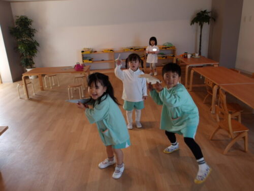 新聞で紙飛行機を折って飛ばして遊びました😁