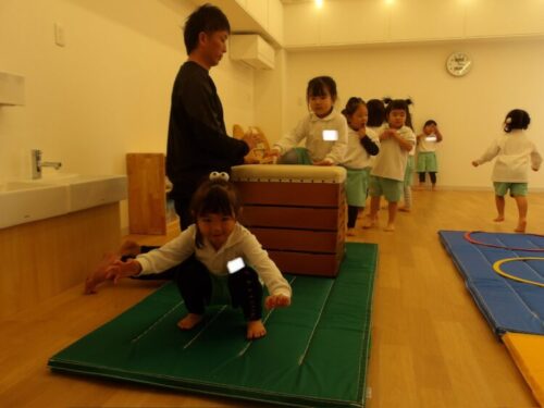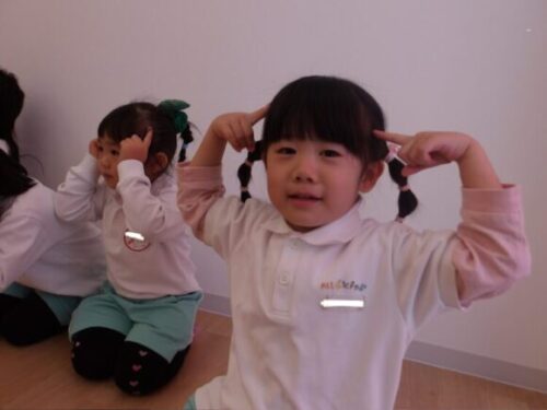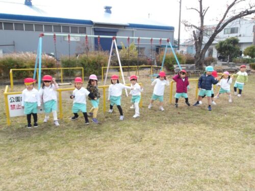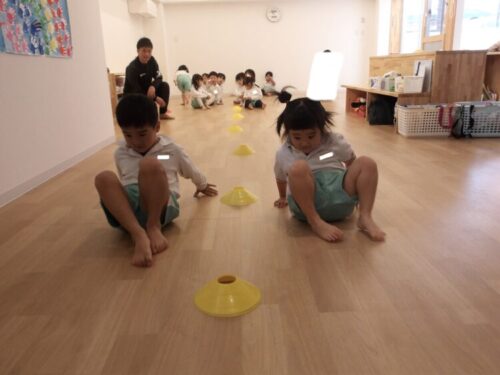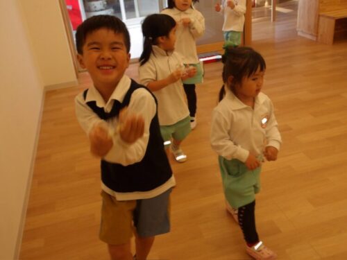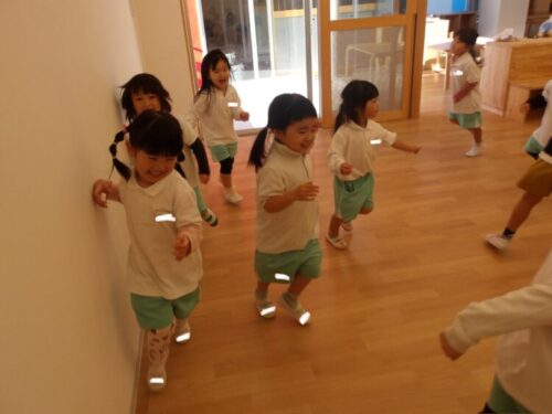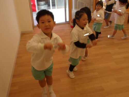 今日の集団遊びは鬼が青、緑、△三角、の言ったところに逃げる色オニと形オニわ、合体させたゲームをしました!