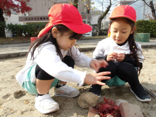 枯れ葉に埋まったり投げたり、山道から転げ落ちたり…それぞれお気に入りの遊び方を見つけて、全力で楽しく遊ぶ姿が見られました😄