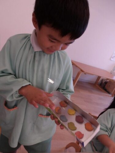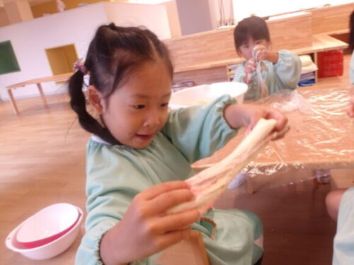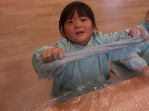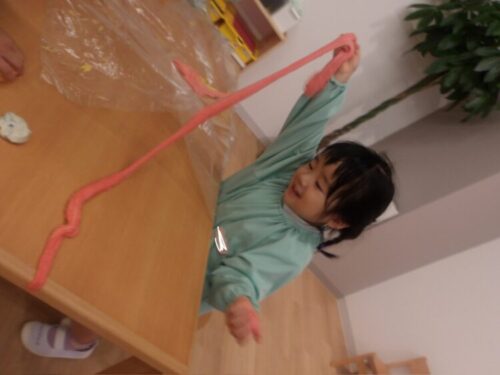 今日は昨日作った小麦粉粘土に食紅を加えて色をつけて遊びました🎶