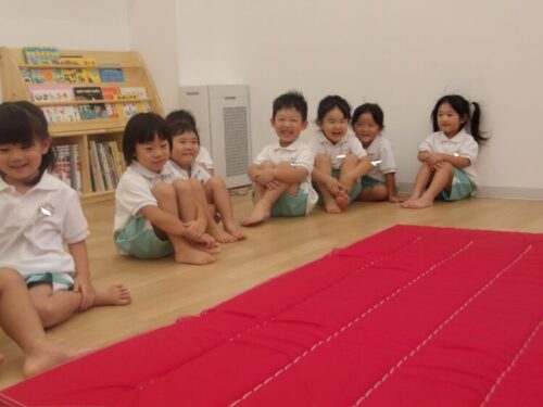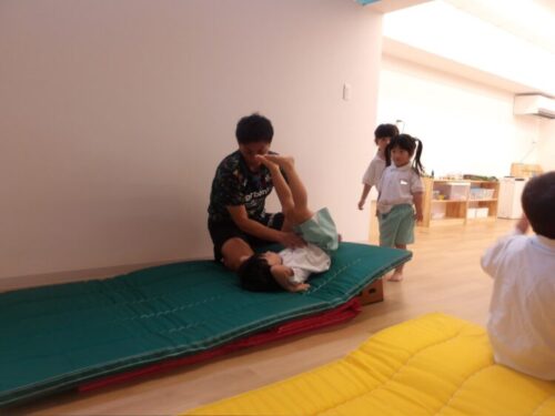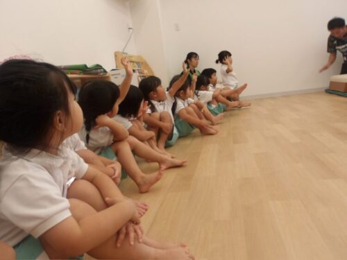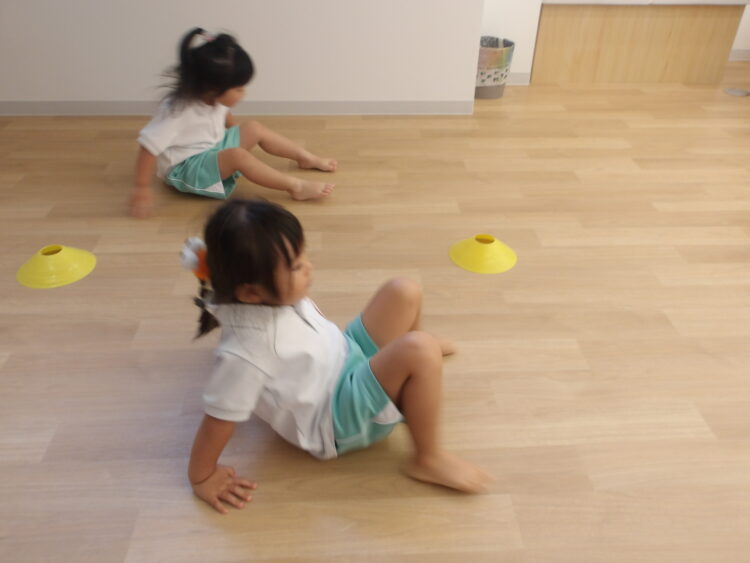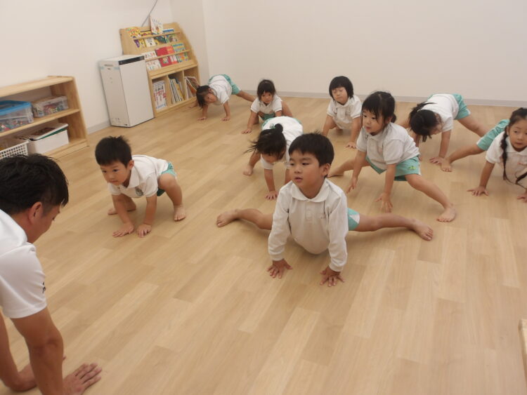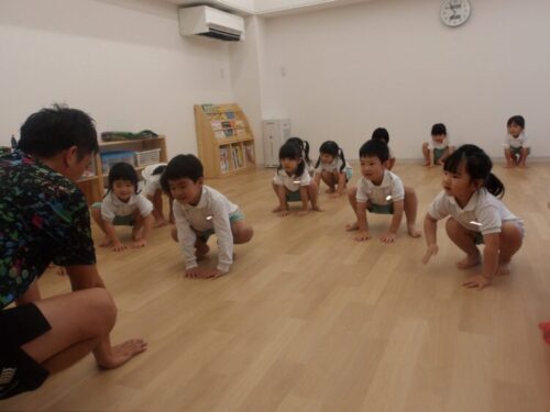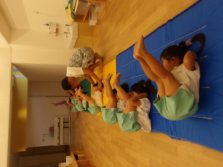 今日はみんなの大好きな火曜日!体操教室の日です。始まる前から「きょうはなにするんだろうね」「とびばこかな~」「まえまわりしたいな♡」などど話していた子どもたちです。
