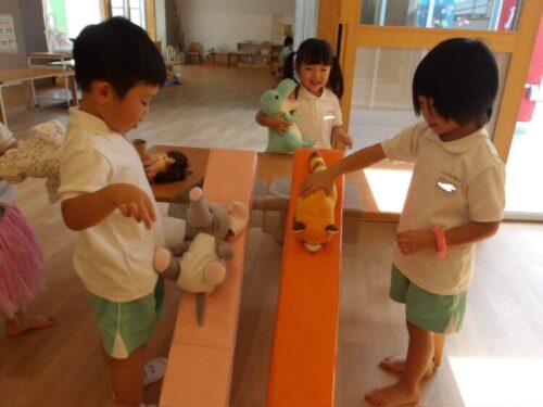 おままごとコーナーでは滑り台があったらいいなという声があり平均台を滑り台がわりに取り入れるとぬいぐるみを滑らせ遊んでました😄