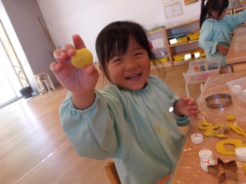 粘土を重ねいろんないろんな色をつくり、クッキーだよ🎶お菓子屋さんだよ!ケーキ屋さんだよ!とたくさん作って並べて、お友達同士でこれください!とごっこ遊びもしてましたよ😁