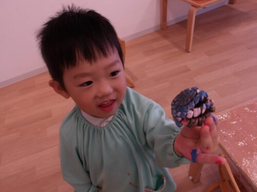 今日は昨日拾った松ぼっくりに色をつけました♪