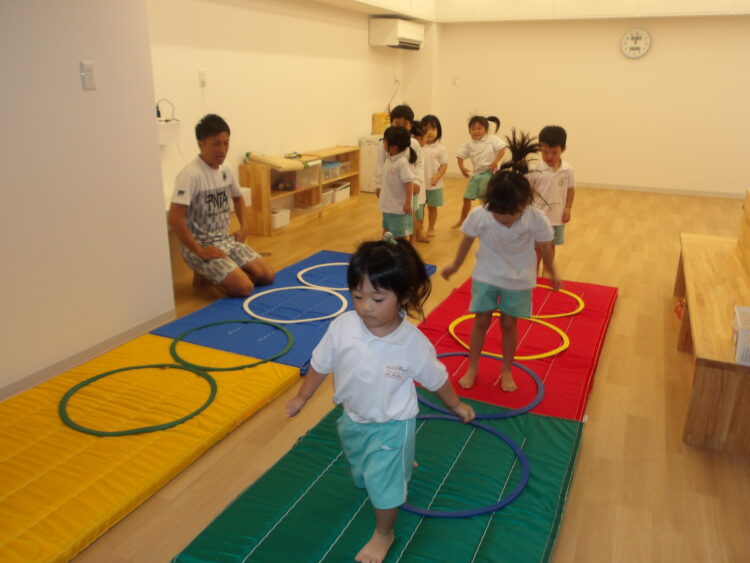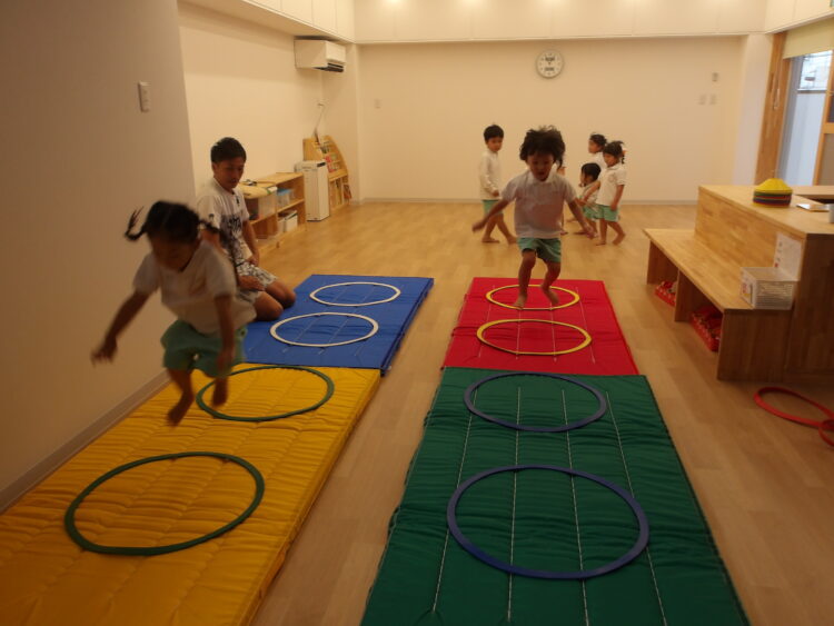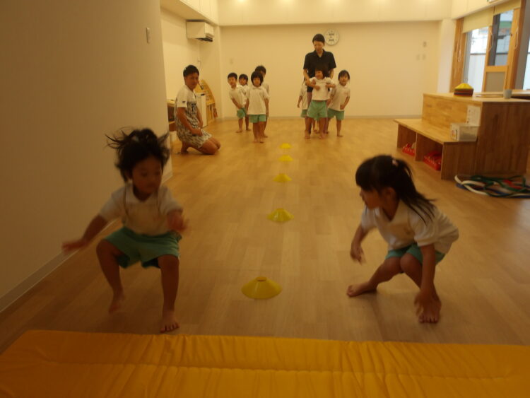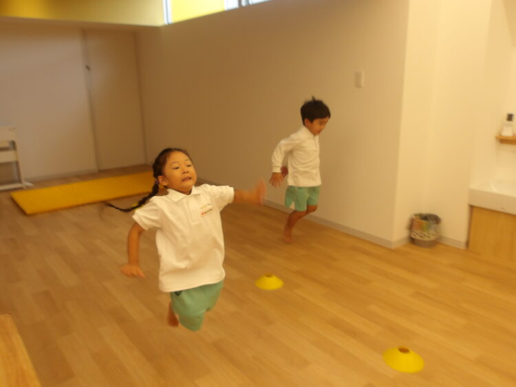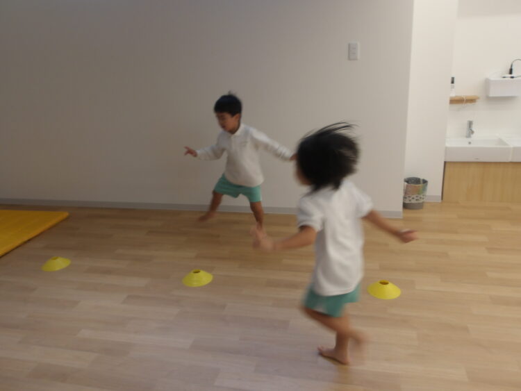 次は、片足ケンケン、両足ジャンプ、横跳びなどいろいろな方法で進み、マットにタッチして戻ってくるというミッションにチャレンジです。