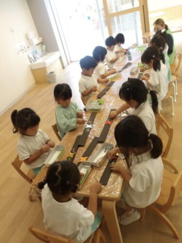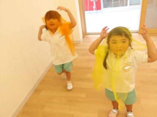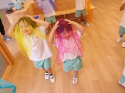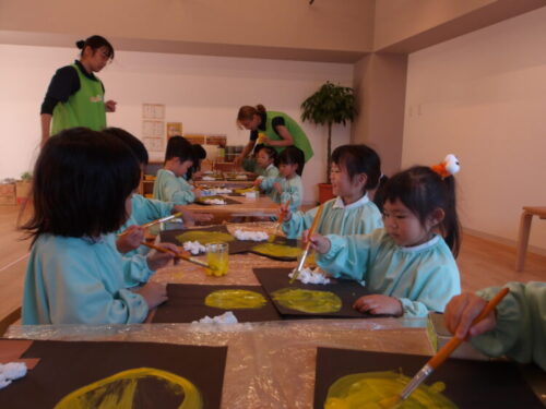 黒い画用紙に黄色を塗ると黄緑に見えた子もいたみたいで、「緑になった!」とと報告しに来てくれるお友だちもいましたよ😃