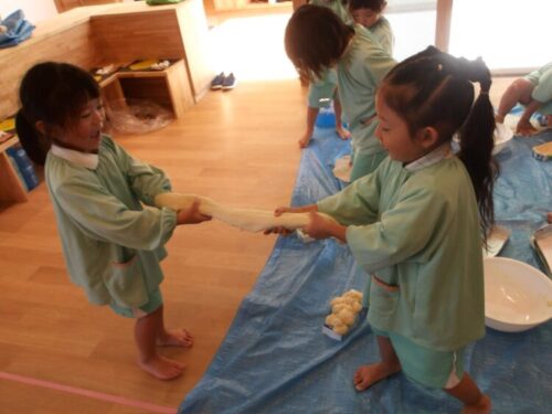 塩、お水、油を投入してチームで力を合わせてコネコネコネコネ!