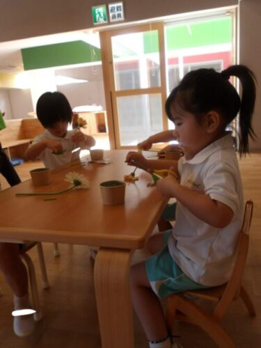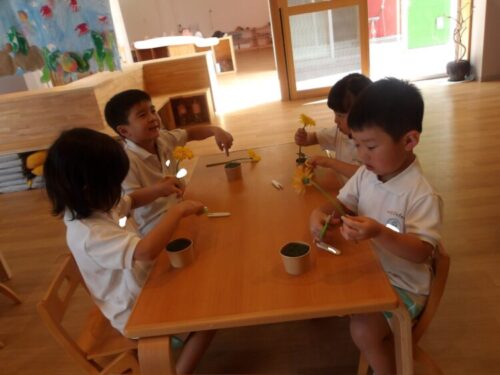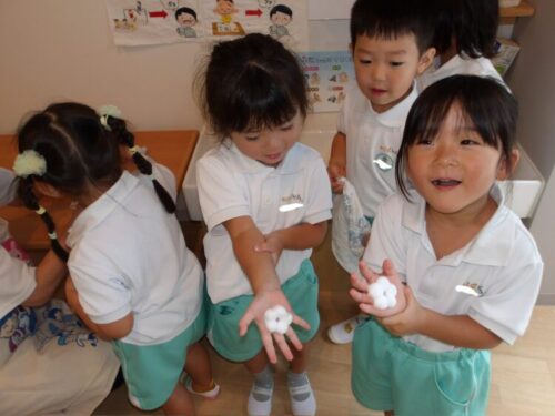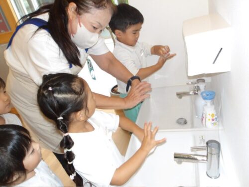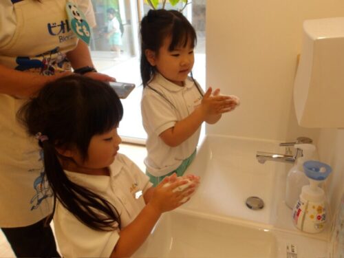 花の泡に興味を持って手洗いも実際にみんなでやってみました😄