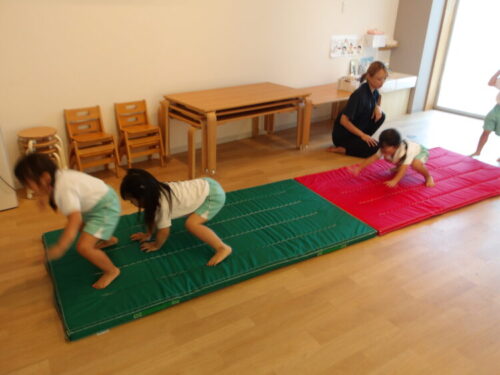 マットでは跳び箱に繋がるカエルジャンプの動きを行い、子供達もどうやるのかどう動くのか考え試行錯誤しながらチャレンジしていましたよ😄