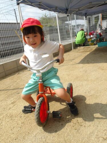 三輪車も地面に線を描いてあげると、それに沿って走ったり、
