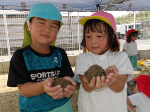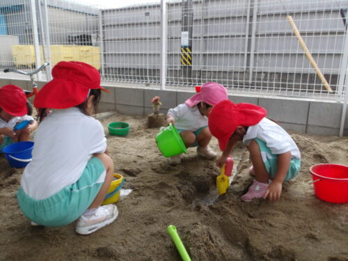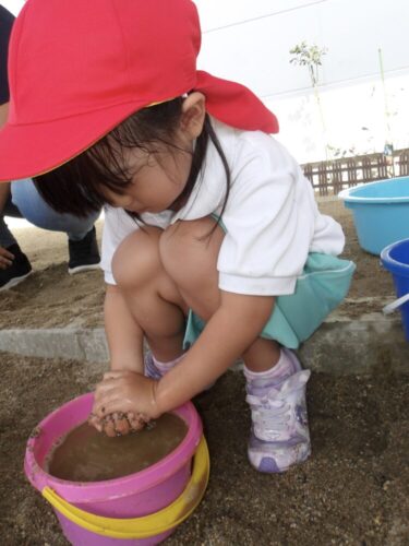まだ暑さもあったので水を足すと早速,「穴を掘ろう‼︎」「池を作ろう!」と友だち同士で声を掛け合って砂遊びが始まりました♪