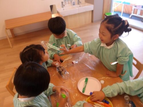 自分の名前の英語の綴りを描いてみたり🔤、虹を描いたり、塗りつぶしたり、自由に模様を書いて、オリジナル水鉄砲を作りました😄