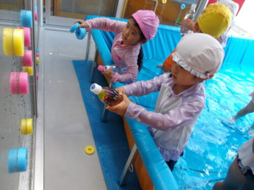 プールスティックをガラスにくっつけて水鉄砲で落とす遊びを提案すると子供達も興味津々😄