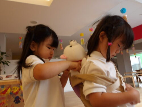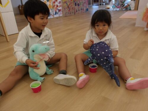 新しいぬいぐるみを導入すると、みんな大喜びで玩具を食べさせたりおんぶしたり世話をして遊んでいましたよ😄