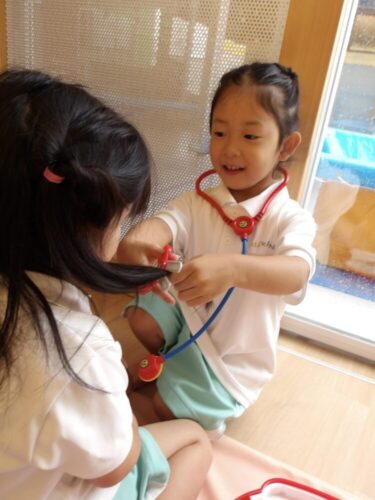 お医者さんごっこもにんきで、痛いところはどこですか?となりきってぬいぐるみや人でお友達と仲良しに過ごせました😄😄