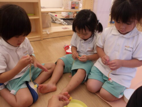 ままごとではビーズに紐をつけたのを導入すると、私もやる!と夢中に紐に通し出して遊んでいましたよ😄