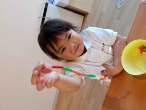 お部屋では昨日の続きの紐通しでのネックレス&ブレスレット作りが始まりました。今日はストローの他にもハートや星、お花の形の飾りも加わり、夢中になって取り組んでいました![]()