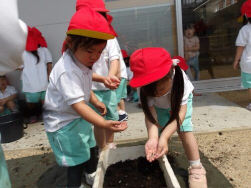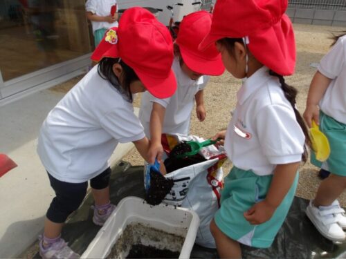 土の触感を楽しみながら土から自分たちでプランターに移し、