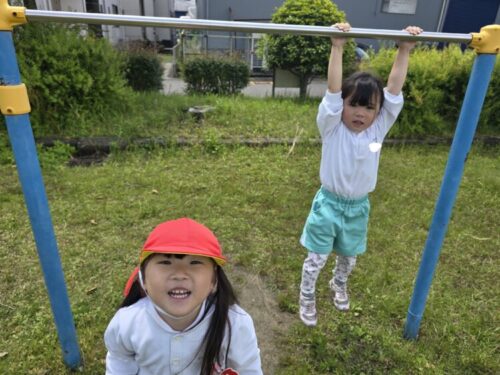 遊具では水たまりで滑り台が使えない分、鉄棒を挑戦するお友達が何人か見られました![]()