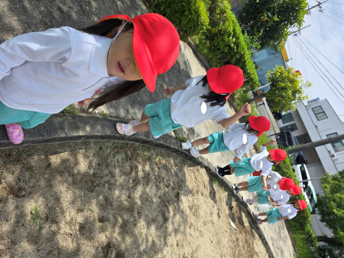 保育者が砂場の段差から落ちないように歩くのを見て子供たちも一緒にやりだし砂場を海に見立て落ちたらサメに食べられる遊びが始まり楽しく遊べました![]()