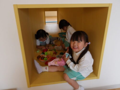 自由遊びになってからはブロックやバズルのパーツをお化粧道具に見立てて先生とから友達とに代わりこどもたち同士でメイクごっこをしていましたよ☺️