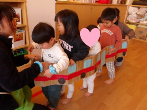 室内では電車ごっこをしましたよ🚃 手に切符を付けて、出発進行✊
