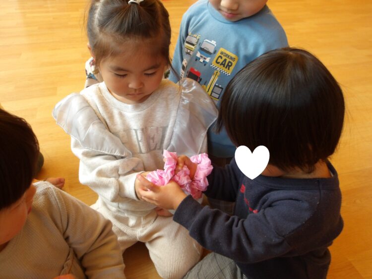 あひる組のお兄さんお姉さんが小さいお友だちに切符のシュシュを付けてくれています💛