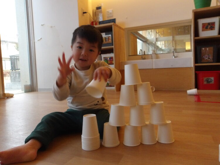 電車ごっこが終わった後は、紙コップ遊びをしました!真剣な表情で積み上げていましたよ🤭