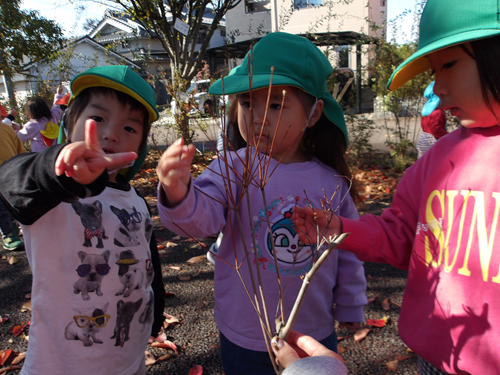 探索場所に着くとさっそく落ち葉を拾ってうれしそうなひよこさん💖