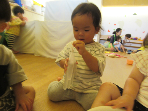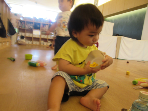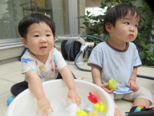 コップやバケツにおもちゃをたくさん集めてジャブジャブ洗ったり、お水を自分にかけて大胆に遊ぶお友だちもいましたよ😄💖