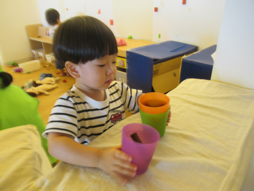 コップの中に色々なフルーツを入れてフルーツジュースをつくっているお友だちを発見👀✨
