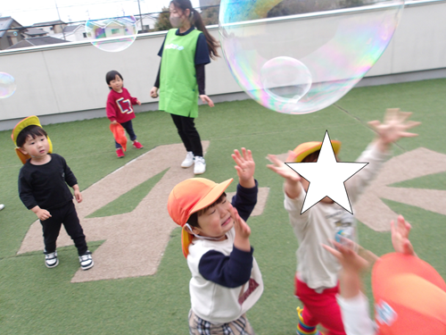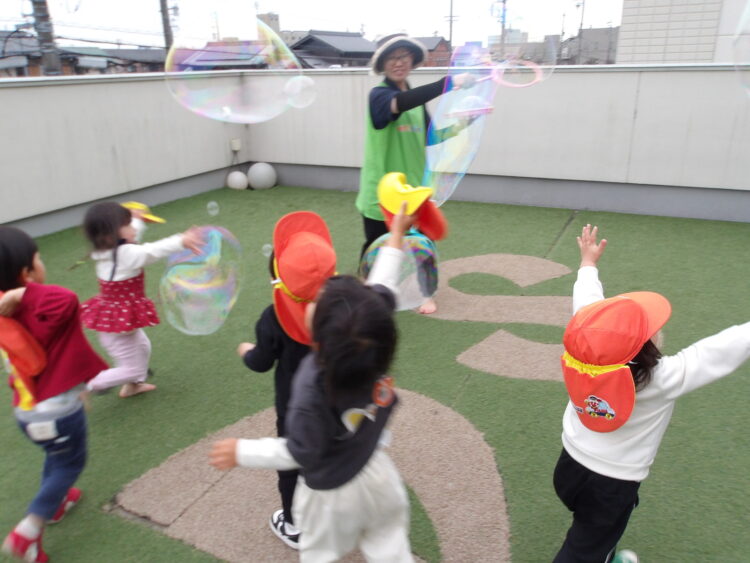 今日はおにごっこやかくれんぼ、すべりだいやしゃぼんだまもしましたが