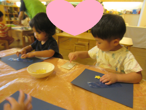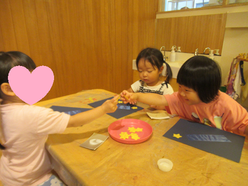 うさぎ組さんは月の台紙に星をのりで貼りました。