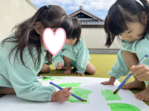 うさぎ組さんはお外で絵の具を使ってハッピースプリングの準備をしましたよ!