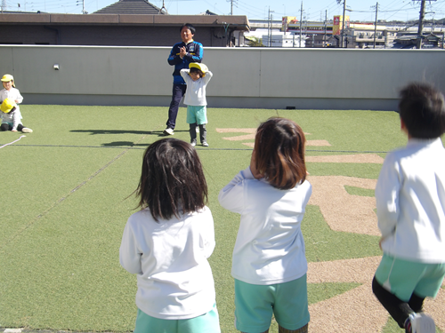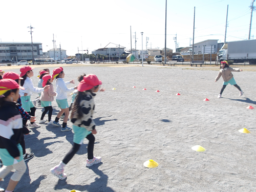 うさぎ組さんは男の子、女の子チームに分かれて相手チームの陣地にたくさんボールを投げる競争をしました!