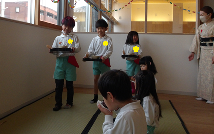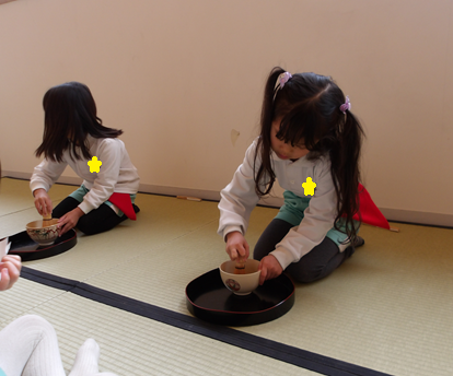 お抹茶を点てる際も、茶筅の持ち方を真似しながら縦にシャカシャカと動かして練習していました。お茶碗を眺めたり、香りを嗅いで「お抹茶のいい匂い!」と楽しんでいました![]()