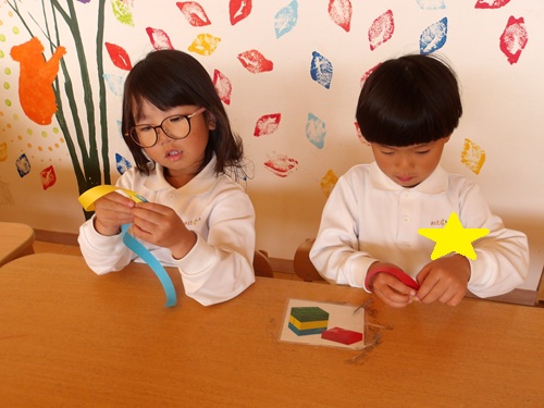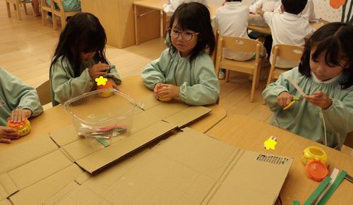 製作コーナーでは、きりん組さんに紙を切ってもらい、うさぎ組、ぱんだ組さんは紙にのりで付け迷路みたいなのができてるが…