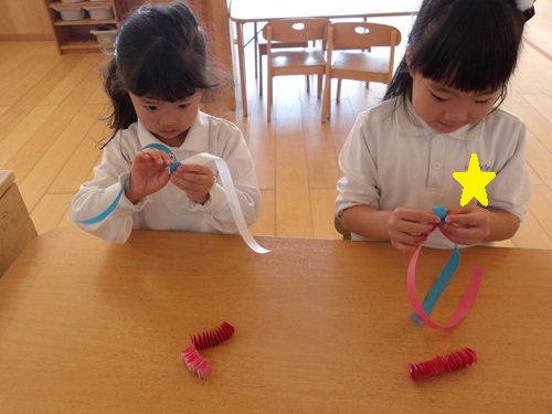室内あそびでは、2本の長い紙を交互に折って蛇腹折りを作りました!