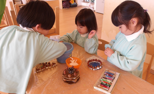 公園で拾ってきたどんぐりや松ぼっくるをボンドでつけて…完成するのが楽しみですね