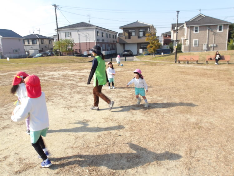 しっぽ取りゲームをしたお友だちは、先生に取られにようにたくさん走って逃げていました