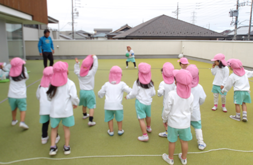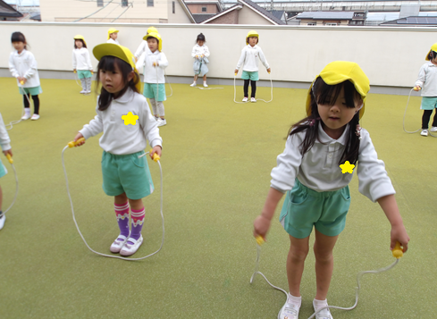 準備体操ではじめに縄跳びをしましたよ、途中で縄に引っかからずに跳べるお友だちが増えてきています