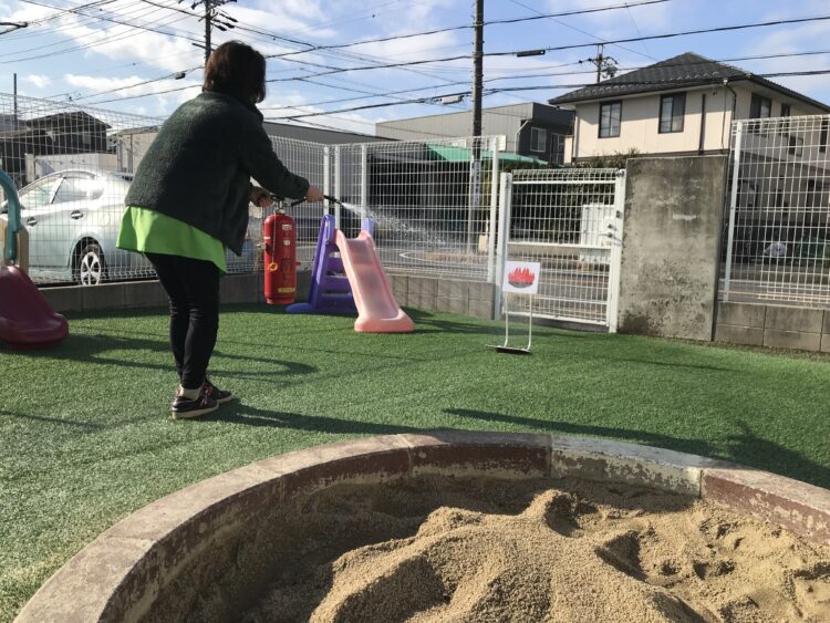 今日は 消防署から「水消火器」「的」をお借りせて、